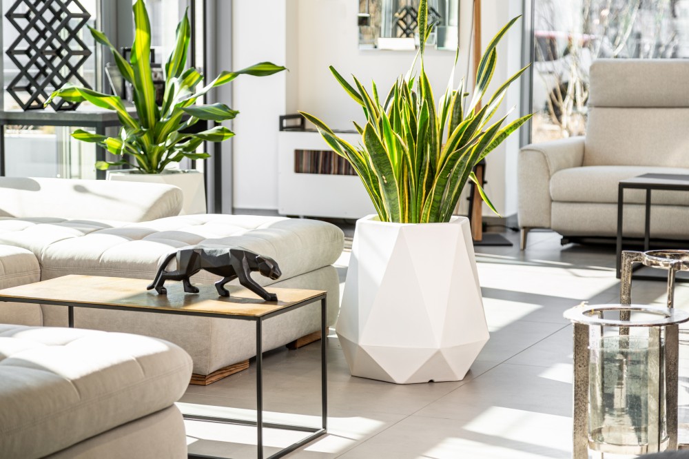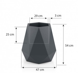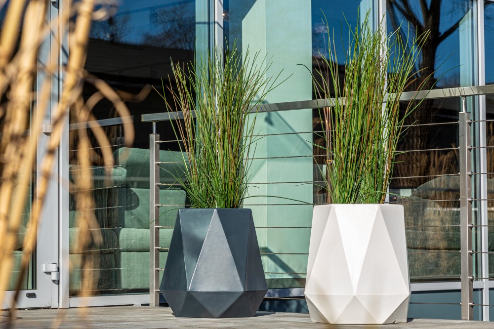 Duża geometryczna donica Flavi sprawdzi się zarówno w prostych wnętrzach jak i bogatych w roślinność tarasach i ogrodach.