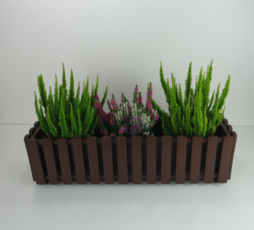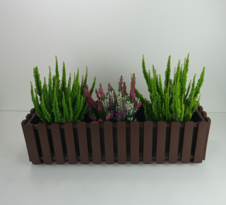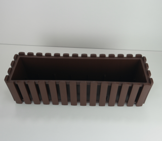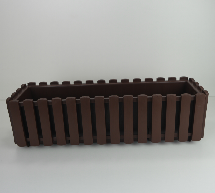 To prostokątna doniczka balkonowa, ma prosty kształt i ciekawą fakturę, przypomina skrzynkę z drewnianych deseczek.