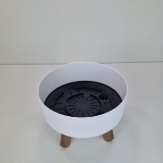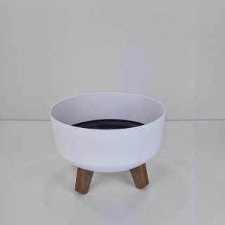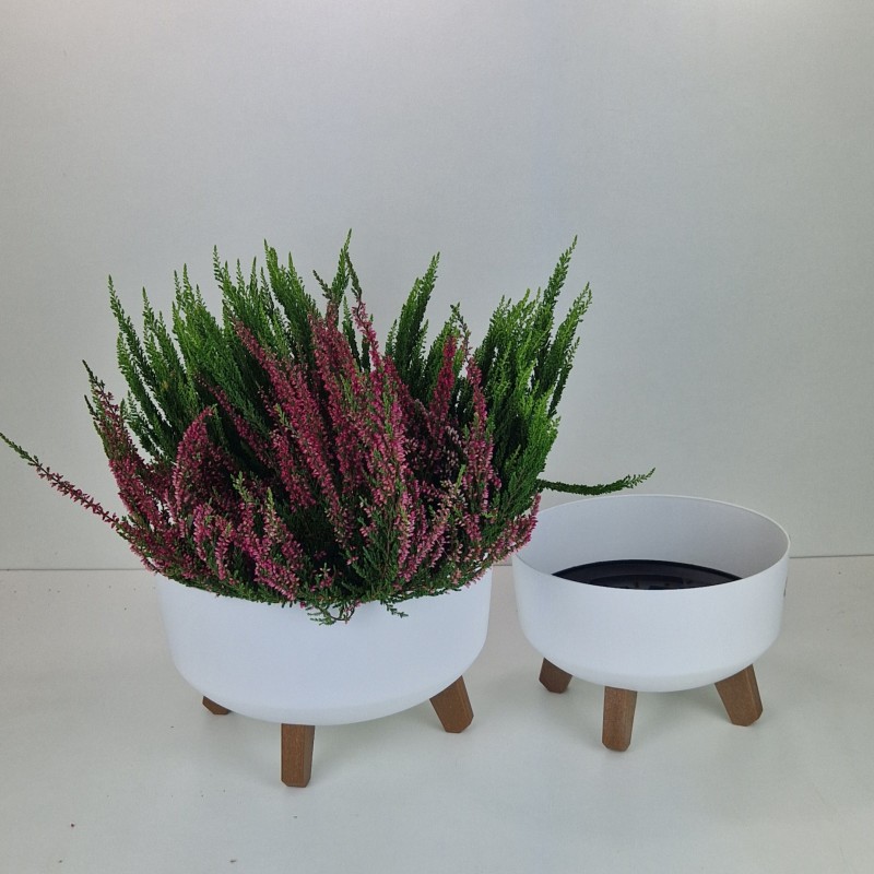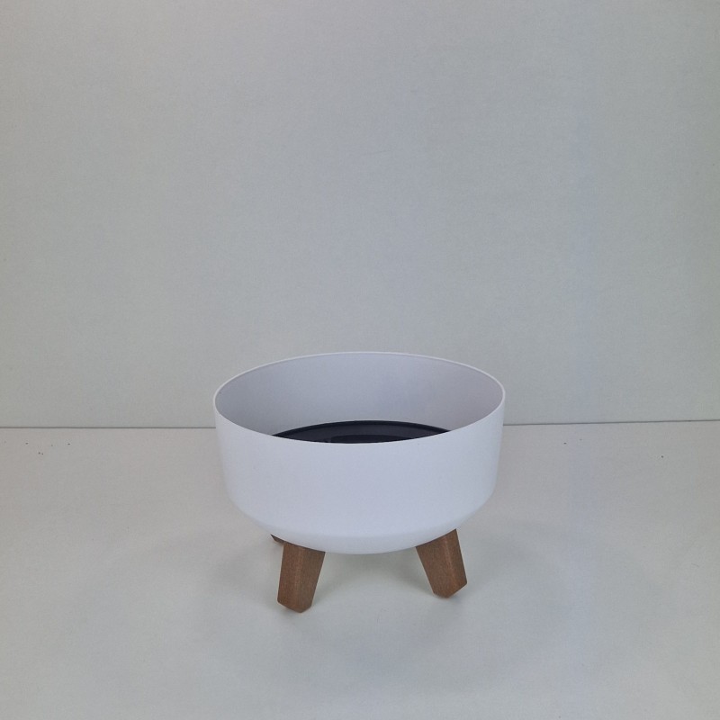 Minimalistyczna doniczka z nóżkami imitującymi drewno, całość ma gładką i prostą formę więc wpasuje się do każdej przestrzeni.