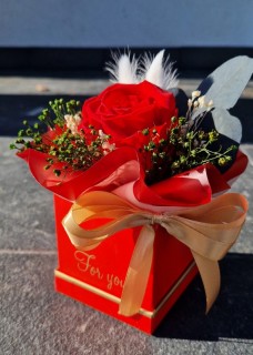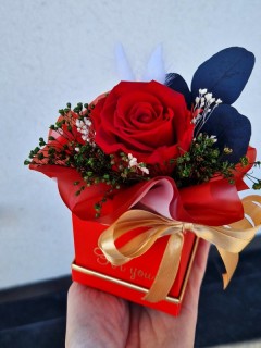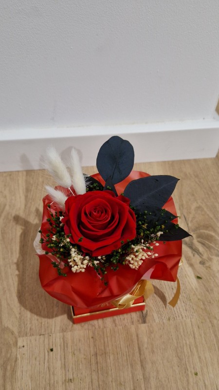 Ten nasz Flower box to ręcznie wykona kompozycja stworzona z wiecznej róży i suszonych roślin w stylowym pudełku w kształcie kostki.