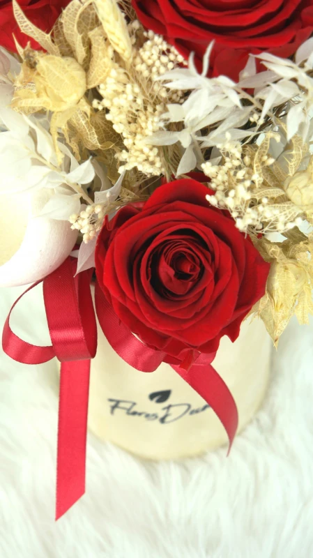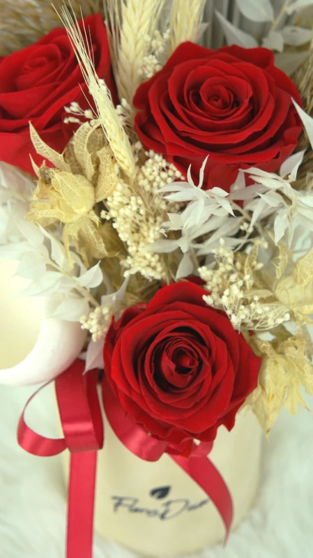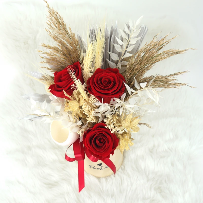Róże w połączeniu z suszonymi roślinami idealnie nadają się na prezent urodzinowy dla najbliższej osoby, czy też jako trwała ozdoba miejsc takich jak biura, hotel, restauracje.