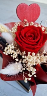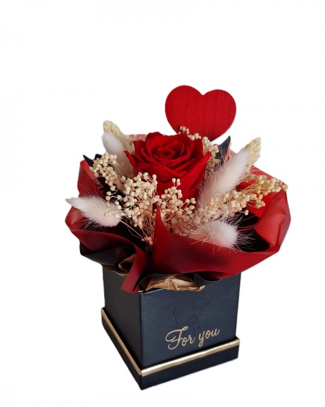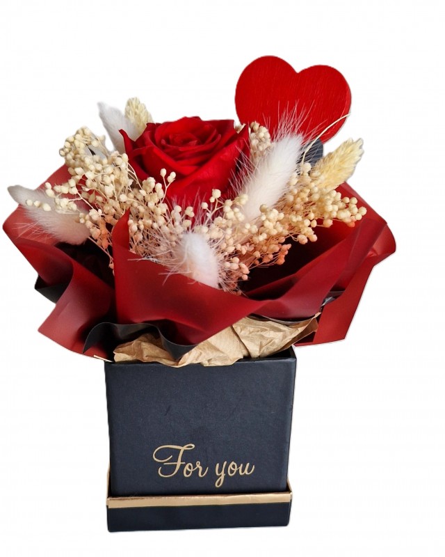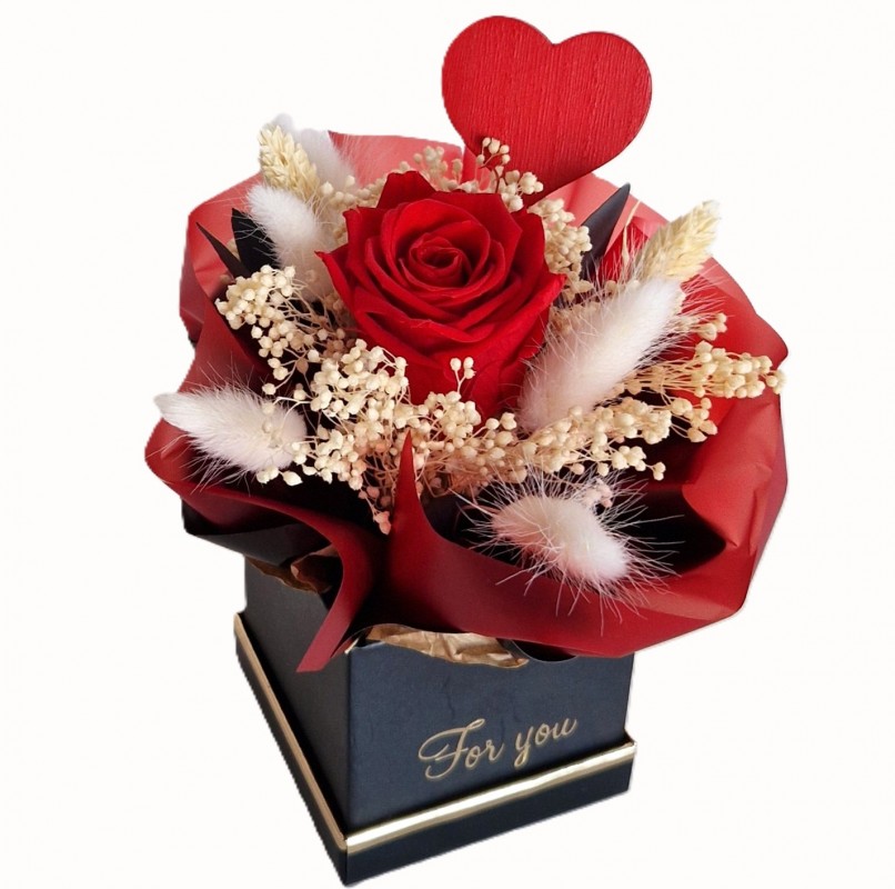 Ten nasz Flower box to ręcznie wykona kompozycja stworzona z wiecznej róży i suszonych roślin w stylowym pudełku w kształcie kostki.